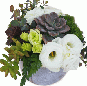 סידור פרחים בכלי מיוחד מעוצב עם סוקולנטים וליזיאנטוס